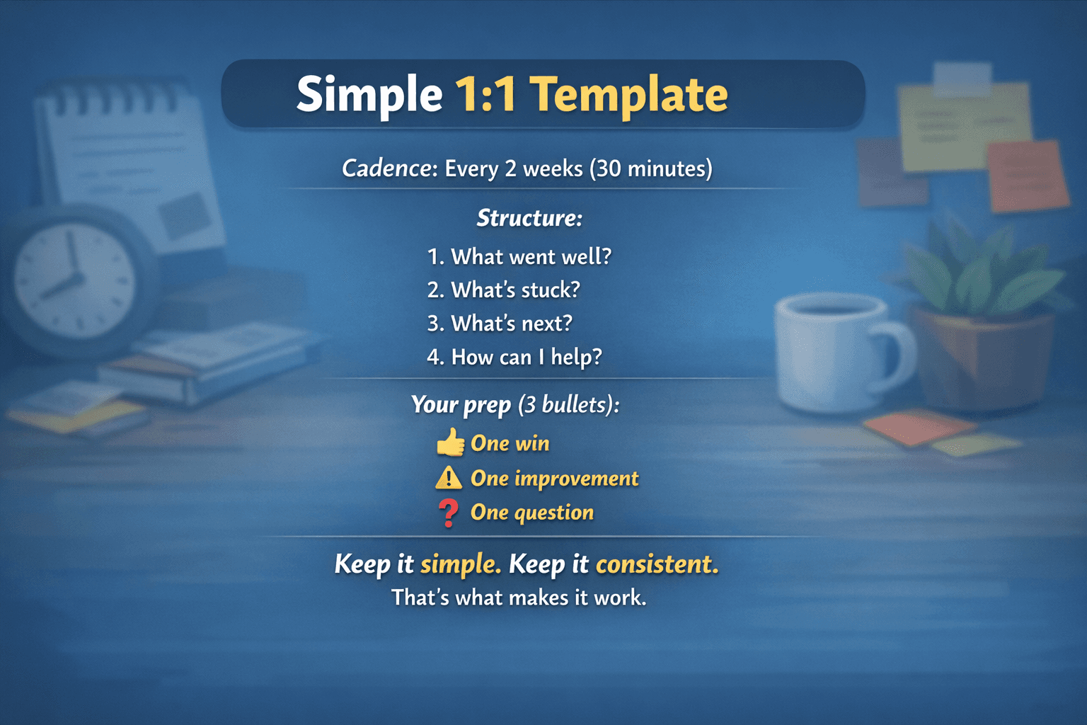 Consistency is the whole game here. A mediocre one-on-one that happens reliably is worth more than a perfect one that keeps getting rescheduled.
